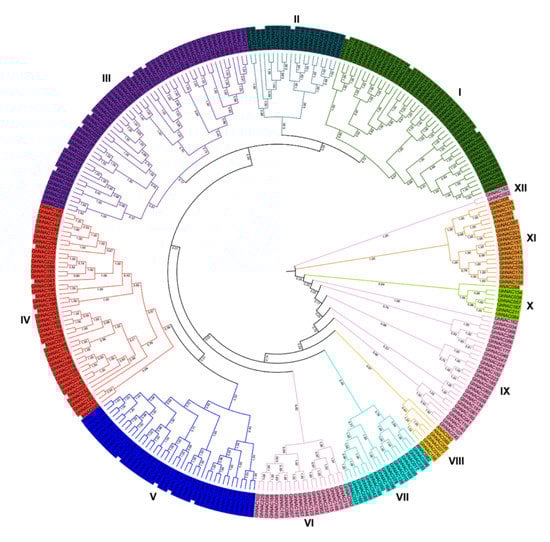 Using the HMM profile of the NAC domain (PF02365) and the NACs’ sequences from Arabidopsis (n = 33), 271 NACs were identified from the reference genome (NAU, v1.1, downloaded from CottonGen) with the names GhNAC001 to GhNAC271. The lengths of GhNACs ranged from 156 (GhNAC028) to 860 (GhNAC118) amino acids, with molecular weights ranging from 17.246 to 94.324 kDa and pI from 4.325 to 10.284 (Table S1). The 271 GhNAC proteins, which were classified into 12 groups and named I to XII, were used to construct a neighbor-joining phylogenetic tree (Figure 1, Table S1). Most subgroups contained at least one Arabidopsis NAC gene (AtNAC), indicating a close relationship between GhNAC and other plants. Among the 12 groups, group III contained the most NAC members (50 GhNACs), followed by group I (42 GhNACs). Group XII had the lowest number of NAC members, with only two GhNACs (GhNAC052 and GhNAC182). In addition, AtNACs, such as ANAC012, ANAC030, ANAC037, and ANAC070 in group IV, played pivotal roles in secondary wall biosynthesis and hormone response, which are important for pathogenic or environmental stress adaptation [3]. A total of 38 GhNACs with high similarity to the gene members in group IV were clustered in group IV. These results suggest that GhNACs in group IV may have functions similar to those of AtNACs, which are potential candidate genes involved in disease resistance.
