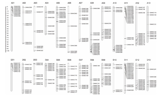 Chromosomal locations of the GhNACs. Scale bar on the left indicates the chromosome lengths (Mb). The chromosome numbers of G. hirsutum L. (A01–A13, D01–D13) are indicated above each vertical bar.