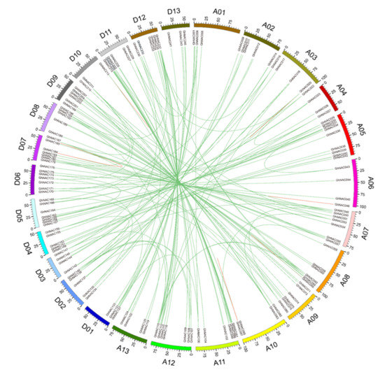 Circos diagram of the GhNAC duplication pairs in G. hirsutum L. The segmental duplication gene pairs were linked with green lines. The tandem duplicates are denoted by red lines. Scale bar marked on the chromosome indicating chromosome lengths (Mb).