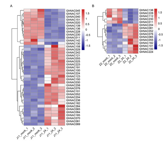 Expression profiling of GhNACs in response to V. dahliae stress. Hierarchical clustering of differentially expressed GhNACs in J11 (A) and Z2 (B). Red and blue colors show upregulation and downregulation, respectively. The original expression values of the GhNACs were normalized using Z-score. The signal intensity ranges from −1.5 to 1.5, as the corresponding color also changes from blue to red.