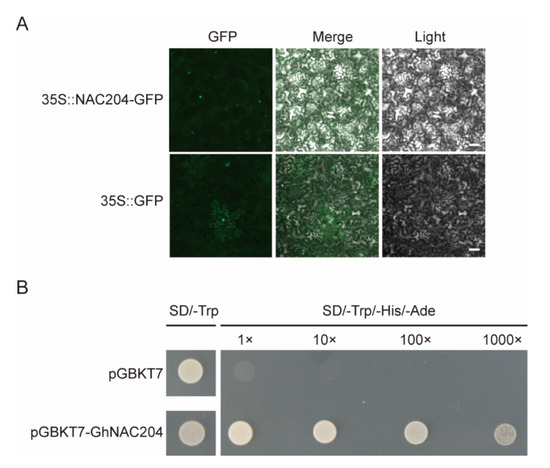 Cells of A. tumefaciens GV3101 were transformed with the pGWB405 vector carrying GhNAC204 under the control of the CaMV 35 S promoter to produce GhNAC204 with a C-terminal green fluorescent protein (GFP) tag. The transformed GV3101 cells were cultured and used to infiltrate leaves of Nicotiana benthamiana. The infiltrated plants were incubated for 48 h; then, green fluorescence was visualized under a confocal laser scanning microscope as previously described [26]. For the assay of the transactivation activity of GhNAC204 protein, the pGBKT7-GhNAC204 recombinant plasmid and the pGBKT7 empty vector were both transformed into the yeast strain AH109 (Takara, Dalian, China). Transformants were grown on SD/-Trp medium for the selection of positive clones and then transferred to SD/-Trp/-His/-Ade medium (Takara, Dalian, China) for the transactivation assay at 30 °C for 3 days.