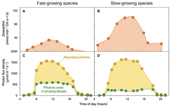 Diurnal time course of changes in (A,B) zeaxanthin level and (C,D) photons absorbed and utilized through photosynthetic electron transport in (A,C) the fast-growing annual crop Helianthus annuus (sunflower) versus (B,D) the slow-growing perennial Vinca major. Data from [18]; re-drawn from [16].