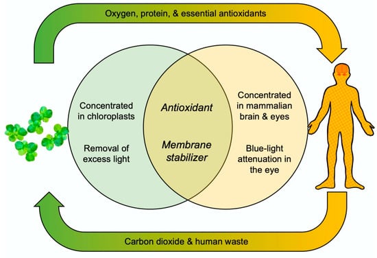 The essential dietary carotenoid zeaxanthin is not only needed to fight radiation damage and system-wide inflammation in humans but also to support mental acuity in healthy young adults (Figure 2; [21,22]). Zeaxanthin enhances basic membrane function in the brain, which supports mental acuity and detoxifies free radicals and other oxidants, which lessens radiation damage and the system-wide inflammation linked to less-than-optimal function, disorders, and diseases. Additional essential micronutrients act synergistically with zeaxanthin in fighting radiation damage and inflammation; zeaxanthin thus works best in a total package—provided by whole foods—with additional plant antioxidants that recycle zeaxanthin for a longer lifetime in inflammation fighting (Figure 2; [22]). Figure 2 places antioxidants with overlapping essential functions in plants and humans into the cycle of oxygen and carbon dioxide exchange, organic nutrients (e.g., protein and antioxidants), and inorganic nutrients (human waste) between photosynthetic and non-photosynthetic organisms. Thereby, Figure 2 highlights that duckweed is an excellent plant component for a regenerative life support system on, e.g., a spacecraft (see also [23,24]).