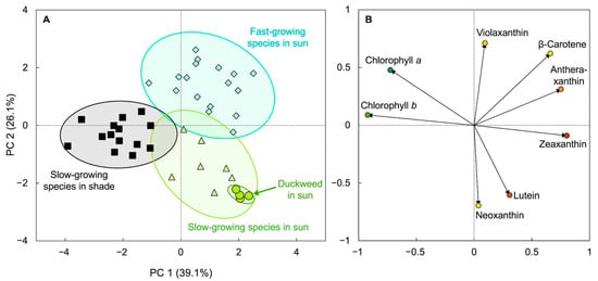 Principal component analysis showing (A) clusters of groups based on similarity (score plot) and (B) how each characteristic used influences a principal component, PC (loading plot). Characteristics used were the various leaf pigments of slow-growing terrestrial species either in shaded environments (black squares) or full sunlight (olive-green triangles), fast-growing (annual and biennial) species (turquoise diamonds) in full sunlight, and duckweed (Lemna minor) that was growing in full sunlight (olive-green circles) near Boulder, CO, USA (for details, see [24,25]). Data from [24,25].