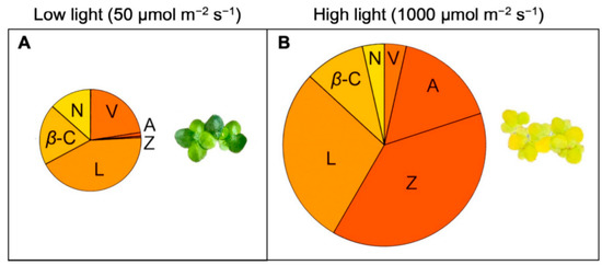 Carotenoid composition of Lemna gibba grown under continuous (A) low or (B) high light intensity. The size of the respective pies represents the molar ratio of the sum of all carotenoids to chlorophyll. Data from [24]; adapted from [16]. A, antheraxanthin, β-C, β-carotene, L, lutein, N, neoxanthin, V, violaxanthin, Z, zeaxanthin.