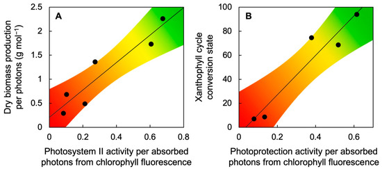 Relationship between (A) dry biomass production per photons and photosystem II activity per absorbed photons from chlorophyll fluorescence (as photosystem II efficiency from Fv′/Fm′ × qP; see [18,24]) or (B) xanthophyll cycle conversion state, (Z + A)/(V + A + Z), and the activity of non-photochemical dissipation of excess absorbed light from chlorophyll fluorescence (as photoprotective thermal dissipation from 0.8 − Fv′/Fm′; see [18,24]) under six different growth-light conditions over a range of light intensities from 50 to 1000 µmol photons m−2 s−1. Data from [23,24]. A, antheraxanthin, V, violaxanthin, Z, zeaxanthin.