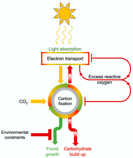 Schematic depiction of the effect of environmental inputs (light, CO2, and factors that limit leaf/frond growth) in triggering feedback inhibition of photosynthesis via repression of photosynthetic genes when carbohydrate builds up in leaves/fronds because of limiting sink activity.