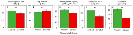Effect of elevated compared to ambient atmospheric CO2 level on (A) the relative growth rate (of frond area expansion) as well as (B) dry biomass, (C) photosynthetic capacity, (D) chlorophyll content, and (E) zeaxanthin content per frond area in Lemna minor. Elevated CO2 level was 0.7%; light environment was continuous light of 700 µmol photons m−2 s−1; nutrient medium was ½ strength Schenk and Hildebrandt medium [72]. For other experimental conditions and methods, see [23]. n.s., not significant. Asterisks indicate significant differences at p < 0.01 (**) or p < 0.001 (***).