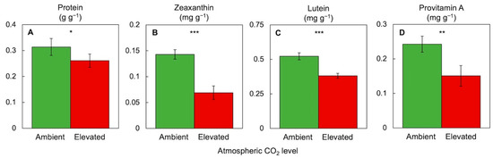 Effect of elevated compared to ambient atmospheric CO2 level on various human nutrients including (A) protein, (B) zeaxanthin, (C) lutein, and (D) provitamin A (β-carotene) content per dry biomass in Lemna minor. CO2, light, and nutrient conditions were as listed in the legend of Figure 8. For protein quantification, see [24]. For all other experimental conditions and carotenoid quantification, see [23]. Asterisks indicate significant differences at p < 0.05 (*), p < 0.01 (**), or p < 0.001 (***).