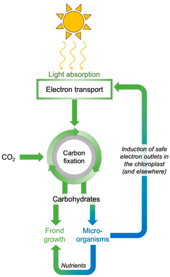 Schematic depiction of the effect of microorganisms in counteracting feedback inhibition of photosynthesis by (i) acting as a sink for carbohydrates, (ii) improving plant nitrogen content in support of new growth (as well as photosynthetic capacity), and (iii) indirectly and directly promoting safe electron outlets in chloroplasts and elsewhere.