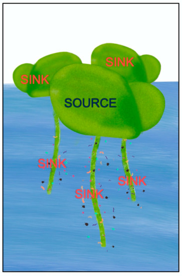 Schematic depiction of a Lemna colony consisting of a mother frond as the source of photosynthate for expanding daughter fronds as well as for the rhizosphere microbiome as sinks of photosynthate.
