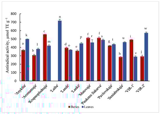 DPPH• antiradical activity of berries and leaves of different cultivars of A. kolomikta. Data were expressed as mean ± SD. Different letters above columns means significant difference between berries or leaves according to Duncan’s least significant difference (LSD) procedure at 1% significance level.