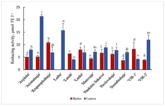 CUPRAC reducing activity of berries and leaves of different cultivars of A. kolomikta. Data were expressed as mean ± SD. Different letters above columns means significant difference between berries or leaves according to Duncan’s least significant difference (LSD) procedure at 1% significance level.