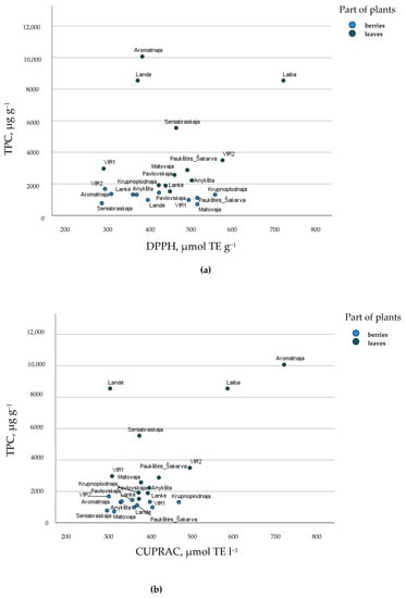 Cultivar’s arrangement describing (a) total phenolic compounds (TPC, µg g−1) and DPPH, µmol TE g−1 antiradical activity and (b) total phenolic compounds (TPC, µg g−1) and CUPRAC, µmol TE g−1 reducing activity of A. kolomikta berries and leaves.