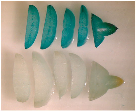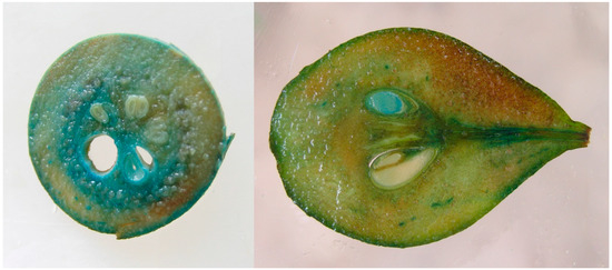 The segregation of the uidA gene in pear progeny was determined by histochemical analysis of GUS expression in two ways. The seeds of 2007 and 2009 were stratified at 4 °C for three months to break dormancy and were sown in a mixture of peat and perlite (3:1) in the greenhouse in spring. Root samples were collected from seedlings and assayed for GUS expression in microtubes. The seeds of 2010, 2011, and 2013 were cleaned from the seed coat, then they were cut into transverse segments and were placed into the wells of a 96-well microtiter plate. Histochemical staining of GUS activity was performed by overnight incubation of the roots or seeds in an X-Gluc solution at 37 °C [64].