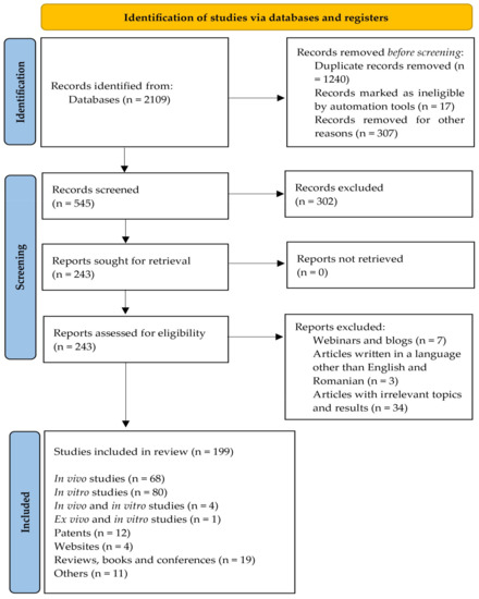Recent studies regarding the phytochemical composition of fruits, leaves, twigs and roots and their beneficial effects for curing different diseases were selected using a PRISMA 2020 flow diagram based on the suggestion of Page et al., 2021 [24]. The steps and selection criteria, followed by the number of the studies used for our review, are shown in the Figure 1. Databases such as PubMed, Scopus, Science Direct, Elsevier, Google Scholar, Google Patents were accessed to search the literature. The Medical Subject Headings keywords included in the search were: “Morus” “Morus nigra”, “Morus alba”, “nutrients Morus”, “bioactive compounds Morus”, “phytochemicals Morus”, “antioxidant capacity Morus”, “Morus diabetes”, “anticancer Morus”, “immunomodulatory Morus”, “food industry Morus” etc. All information systematized in the tables was obtained from research articles (in vivo/ex vivo/in vitro studies) between 2016 to 2021. Studies published in languages other than English were excluded, except one patent which was written in Romanian. A total of 199 studies were selected and included in this review.