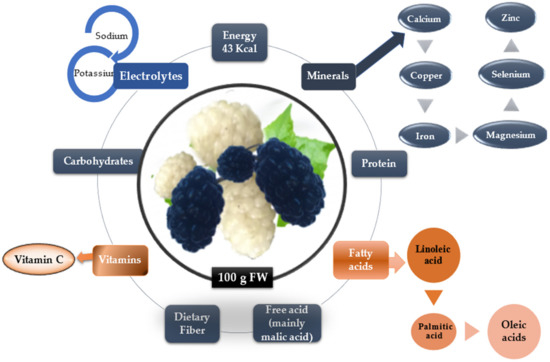 Figure 2 summarizes the nutrients in mulberry fruits with huge importance in human metabolism.