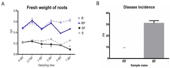 Comparison analysis fresh weight of roots and Fusarium wilt disease occurrence on different watermelon varieties after FON inoculation: (A) Comparison analysis of fresh weight of roots in different samples; (B) Comparison analysis of disease incidence in different samples. S, Susceptible cultivar + mock-inoculation control (H2O2); R, Resistant cultivar + mock-inoculation control (H2O2); SF, Susceptible cultivar + FON; RF, Resistant cultivar + FON. Moreover, 0 dpi (before treatment); 12 hpi (12 h post inoculation); 1 dpi (1 day post inoculation); 3 dpi (3 days post inoculation); 5 dpi (5 days post inoculation); 7 dpi (7 days post inoculation). Data were expressed as mean ± SE (n = 3). Multiple t tests of Two-way ANOVA (*, p ≤ 0.05; ***, p ≤ 0.0001).