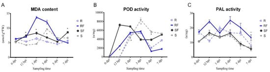 Comparison analysis of physiological indexes changes: (A) Dynamic changes in MDA content at different sampling time in different samples; (B) Dynamic changes in POD enzyme activities at different sampling time in different samples; (C) Dynamic changes in PAL enzyme activities at different sampling time in different samples. S, Susceptible cultivar + mock-inoculation control (H2O2); R, Resistant cultivar + mock-inoculation control (H2O2); SF, Susceptible cultivar + FON; RF, Resistant cultivar + FON. Moreover, 0 dpi (before treatment); 12 hpi (12 h post inoculation); 1 dpi (1 day post inoculation); 3 dpi (3 days post inoculation); 5 dpi (5 days post inoculation); 7 dpi (7 days post inoculation). Data were expressed as mean ± SE (n = 3). Multiple t tests of Two-way ANOVA (*, p ≤ 0.001; **, p ≤ 0.0001).