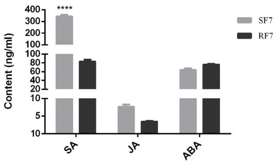 Comparison analysis of SA, JA, and ABA contents in different samples. SF7, Susceptible cultivar + FON, 7 days post inoculation (7 dpi); RF7, Resistant cultivar + FON, 7 days post inoculation (7 dpi). Data were expressed as mean ± SE (n = 3). Multiple t-test of Two-way ANOVA (****, p ≤ 0.0001).