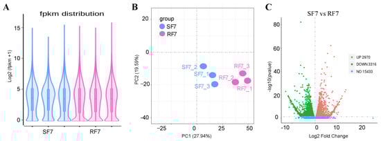 RNA-Seq comparison analysis of watermelon gene expression in resistance and sensitivity varieties: (A) The violin diagram of FPKM distribution; (B) PCA analysis of different samples; (C) Volcano map of DEGs between resistant and susceptible cultivars. Note: SF7, Susceptible cultivar + FON, 7 days post inoculation (7 dpi); RF7, Resistant cultivar + FON, 7 days post inoculation (7 dpi). Three independent replicates.