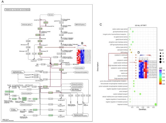 Function enrichment analysis of differential watermelon varieties: (A) Different expressed genes in Terpenoid backbone biosynthesis pathways; (B) Heatmap of 10 DEGs in Terpenoid backbone biosynthesis pathways; (C) All genes GO enrichment significant analysis; (D) Heatmap of 11 DEGs in GO enrichment analysis. Note: SF7, Susceptible cultivar +FON, 7 days post inoculation (7 dpi); RF7, Resistant cultivar+FON, 7 days post inoculation (7 dpi). Three independent replicates. Blue bands indicate low gene expression and red bands high gene expression.