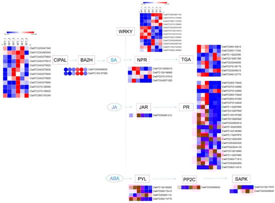 To examine the molecular mechanisms of genes involved in phytohormones signal transduction pathways, we used a heatmap to analyze the differences in resistant and susceptible watermelon varieties (Figure 7).