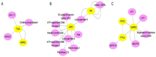 The schematic of SA, JA, and ABA signaling-related proteins network in watermelon: (A) Interaction network of SA signaling-related proteins in watermelon roots at 7 days after FON infection; (B) Interaction network of JA signaling-related proteins watermelon roots at 7 days after FON infection; (C) Interaction network of ABA signaling-related proteins watermelon roots at 7 days after FON infection. Each node in the diagram represents a protein, and each connecting line represents the interaction between connected proteins.