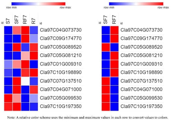 Most genes involved in the SA pathway were highly expressed in SF7 compared with RF7, where only Cla97C01G009310 significantly up-regulated expression in RF7. There were 24 DEGs in the JA pathway, Cla97C07G130430, Cla97C10G192210, Cla97C09G174730, Cla97C10G186220, Cla97C05G100240, Cla97C04G078620, Cla97C05G105650, and Cla97C05G100320, all of which significantly up-regulated expression in RF7 compared with SF7. Among the 37 significantly DEGs involved in ABA pathway, there were 14 DEGs significantly up-regulated in the expression of RF7 compared with SF7, namely, Cla97C06G123770, Cla97C09G174770, Cla97C10G186260, Cla97C01G023840, Cla97C11G221400, Cla97C08G158420, Cla97C01G010380, Cla97C10G188860, Cla97C09G172410, Cla97C03G063210, Cla97C01G020790, Cla97C05G106700, Cla97C07G134120, and Cla97C01G006610. There were 48 significantly DEGs involved in the ET pathway, Cla97C06G114420 and Cla97C11G223860 highly up-regulated expression in RF7 compared with SF7; only Cla97C05G108770 was expressed in RF7. There were 13 significant DEGs involved in the CTK pathway, Cla97C11G207380 and Cla97C05G099290 highly up-regulated expression in RF7 compared with SF7; only Cla97C02G040700 was expressed in RF7. Among the 15 significantly DEGs involved in IAA pathway, Cla97C08G155010 and Cla97C11G217540 highly up-regulated expression in SF7 compared with RF7; only Cla97C05G107110 was expressed in SF7. Cla97C05G099610, Cla97C08G145860, and Cla97C05G099600 significantly up-regulated expression in RF7 compared with SF7 in the GA pathway (Table S2).
