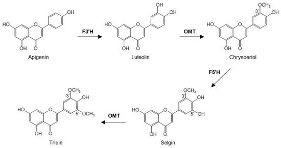 Biosynthesis of tricin from apigenin. F3′H, flavonoid 3′-hydroxylase; OMT, O-methyltransferase; F5′H, flavonoid 5′-hydroxylase.