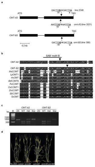 The premature stop codons in OMT-A2 (mutant line 3521; designated omt-A2) and OMT-B2 (line 388; designated omt-B2) lead to truncated proteins that lack 98 and 93 amino acids from the C-terminal end, respectively (Figure 2a). These missing amino acids are located within a highly conserved region among plant OMTs and encompass one of the previously reported SAM binding motifs (Figure 2b) [16]. As such, the resultant truncated OMT2 proteins do not possess the amino acids critical for enzyme activity and likely lead to loss-of-function mutants.