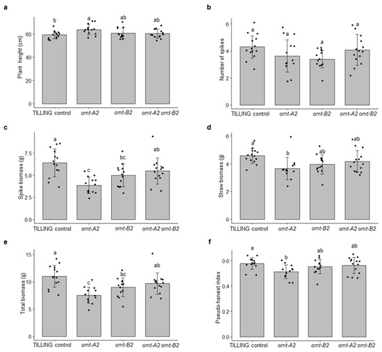 Growth data of TILLING control and mutant plants of wheat O-methyltransferase 2 (OMT2) homoeologs. Means ± S.D. of TILING control (n = 14), omt-A2 (n = 13), omt-B2 (n = 13), and omt-A2 omt-B2 (n = 14) for plant height (a), number of spikes (b), spike biomass (c), straw biomass (d), total biomass (e), and pseudo-harvest index (f) are shown. Different letters indicate significant differences (p < 0.05) between genotypes for each growth parameter.