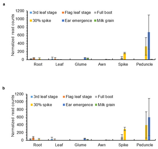 Expression levels of OMT-A2 (a) and OMT-B2 (b) in different wheat tissues. Data were obtained from www.wheat-expression.com (accessed on 18 November 2021) and graphed based on cv. Azhurnaya. Normalized read counts (means ± S.D. of three biological replicates) in roots, leaves, glumes, awns, spikes, and peduncles at 3rd leaf, flag leaf, full boot, 30% spike, ear emergence, and milk grain stages are shown.