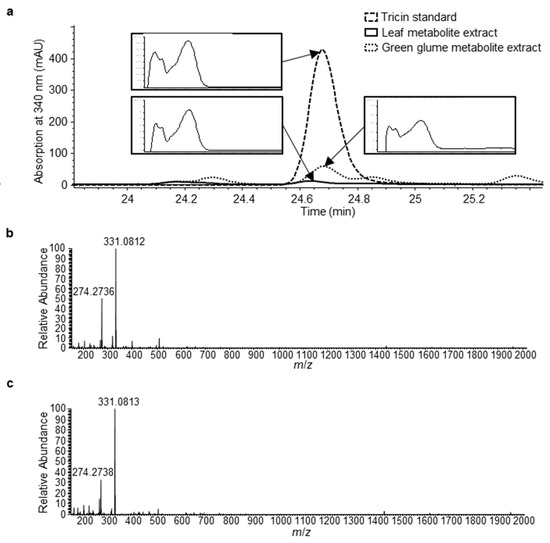 To understand whether tricin is produced in leaves and glumes where the OMT2 homoeologs showed relatively low expression (Figure 4), the glume tissue together with leaves was examined for the accumulation of tricin using high-performance liquid chromatography (HPLC) (Figure 5). The peak eluted at 24.6 min of leaf and glume phenolic metabolite extracts matches the retention time and absorption spectrum of the authentic tricin standard (Figure 5a), and it appears to be more abundant in glumes than leaves. The 24.6 min peak was collected from multiple HPLC runs of glume extracts, pooled, and subjected to mass spectrometry (MS) analysis, which showed a mass spectrum that matches the tricin standard (Figure 5b,c).