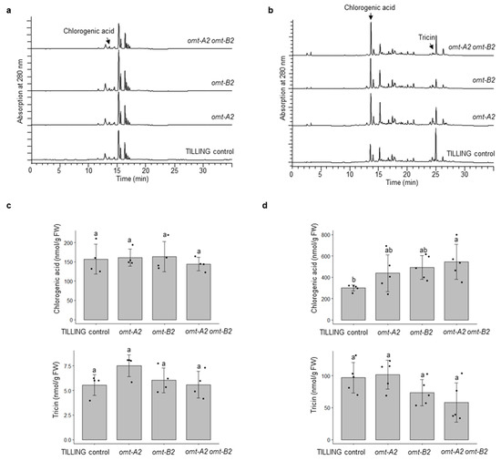 Phenolic profiling of TILLING control and mutant plants. HPLC chromatograms of TILLING control, and the omt-A2, omt-B2, and omt-A2 omt-B2 mutants in 4-week-old leaves (4 biological replicates) (a), and 8-week-old glumes (5 biological replicates) (b) are shown. The peaks corresponding to chlorogenic acid and tricin were quantified and compared among the genotypes for leaves (c) and glumes (d). Different letters indicate significant differences (p < 0.05) between genotypes for each metabolite. FW, fresh weight.