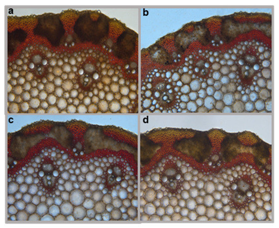 Histochemical analysis of lignin in cross-sections of wheat stems. Representative Mäule staining images of (a) TILLING control, (b) omt-B2 mutant, (c) omt-A2 mutant, and (d) omt-A2 omt-B2 mutant are shown.