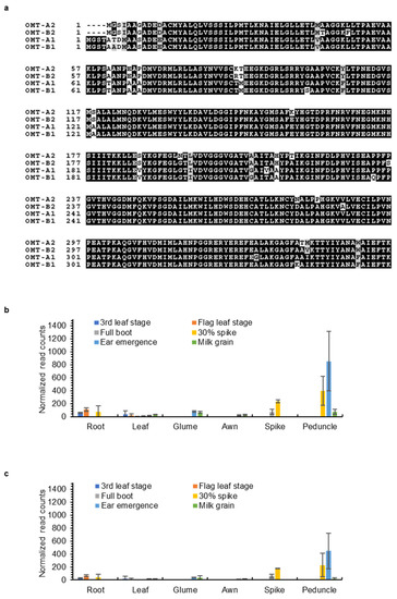 Sequences and expression of wheat OMT-A1 and OMT-B1 homoeologs. (a) Protein sequence alignment of wheat OMT1 and OMT2 homoeologs. Expression levels of OMT-A1 (b) and OMT-B1 (c) in different wheat tissues. Data were obtained from www.wheat-expression.com (accessed on 18 November 2021) and graphed based on cv. Azhurnaya. Normalized transcript counts (means ± S.D. of three biological replicates) in roots, leaves, glumes, awns, spikes, and peduncles at 3rd leaf, flag leaf, full boot, 30% spike, ear emergence, and milk grain stages are shown.