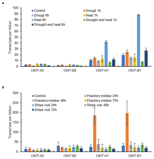 Expression levels of OMT1 and OMT2 homoeologs in wheat leaves subjected to abiotic (a) and biotic (b) stresses. Data on leaves of hexaploid wheat cv. TAM 107 exposed to drought and heat stresses were obtained from Liu et al., 2015 [21] and those on leaves of hexaploid wheat cv. N9134 inoculated with powdery mildew and stripe rust pathogens were obtained from Zhang et al., 2014 [22]. Transcripts per Million [means ± S.D. of two (drought and heat stresses) or three (fungal pathogens) biological replicates] are shown.