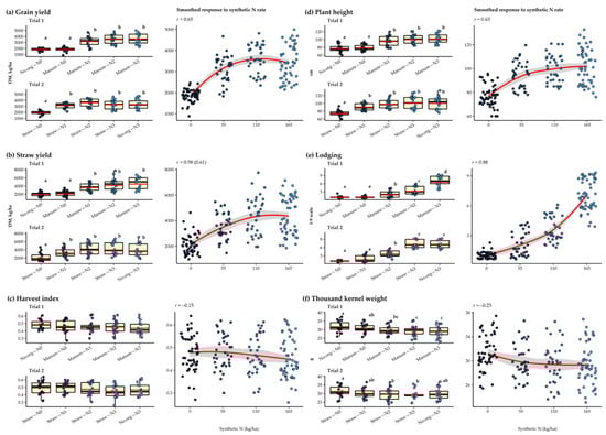 The response of oat agronomic performance traits (a–f) to different N rates and agronomic management practices applied in a long-term field experiment during 2015–2020. The red crossbar in the boxplot indicates the mean, while the dots represent individual observations. Means marked with different letters represent significant differences within each trial according to Tukey’s HSD test (α = 0.05). The smoothed conditional means method (Loes method) represents the overall observed response of the selected variables to the synthetic N rate and the correlation coefficient. When the data was transformed in both trials, the “r” value in brackets indicates the correlation coefficient for the transformed data.