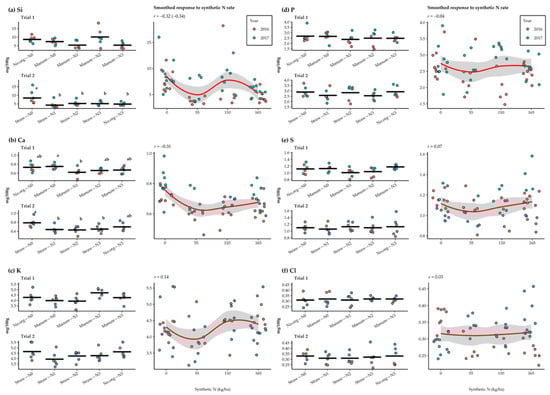 Response of macroelements (a–f) in oat grains to N rates and agronomic management practices applied in a long-term field experiment in 2016–2017. The crossbar indicates the mean value, while the dots represent individual observations. Means marked with different letters represent significant differences according to Tukey’s HSD test (α = 0.05) within each trial. The smoothed conditional means method (Loes method) represents the overall observed response of the selected variables to the synthetic N rate and the correlation coefficient. When the data was transformed in both trials, the “r” value in brackets indicates the correlation coefficient for the transformed data.