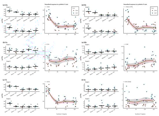 Response of microelements (a–f) in oat grains to N rates and agronomic management practices applied in a long-term field experiment in 2016–2017. The crossbar indicates the mean value, while the dots represent individual observations. Means marked with different letters represent significant differences according to Tukey’s HSD test (α = 0.05) within each trial. The smoothed conditional means method (Loes method) represents the overall observed response of the selected variables to the synthetic N rate and the correlation coefficient. When the data was transformed in both trials, the “r” value in brackets indicates the correlation coefficient for the transformed data.