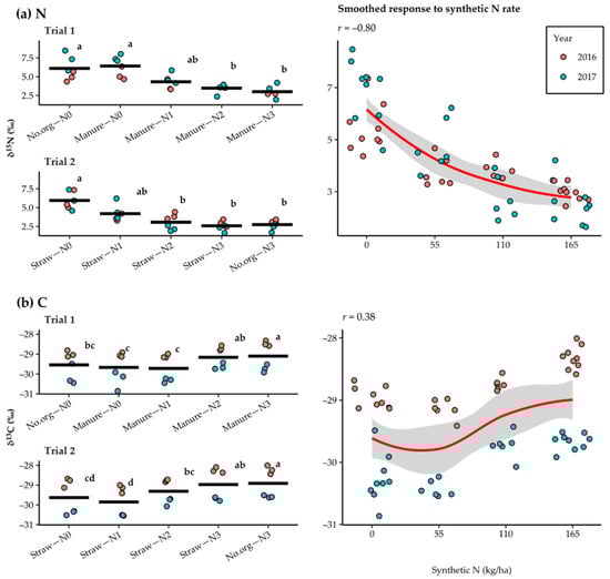 Response of δ15N and δ13C values (a,b) in oat grains to N rates and agronomic management practices applied in a long-term field experiment in 2016–2017. The crossbar indicates the mean value, while the dots represent individual observations. Means marked with different letters represent significant differences according to Tukey’s HSD test (α = 0.05) within each trial. The smoothed conditional means method (Loes method) shows the overall observed response of the selected variables to the synthetic N rate and the correlation coefficient.