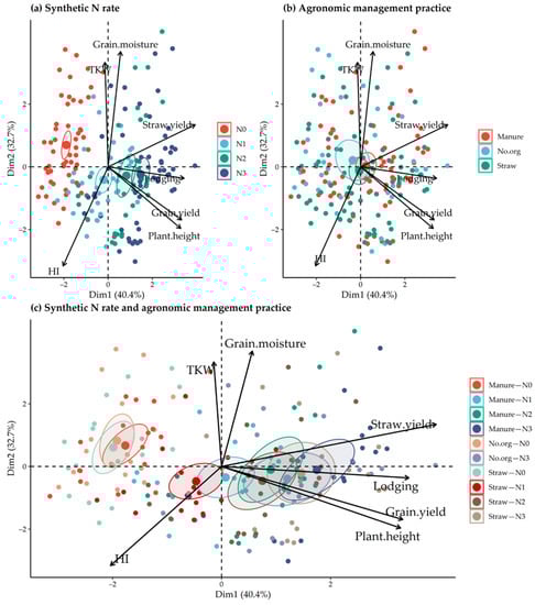 PCA analysis score plots (a–c) of oat agronomic performance traits (grain and straw yield, grain moisture, plant height, plant lodging, TKW and HI) during 2015–2020 as a function of applied N rate and agronomic management practices of the long-term field experiment for the first and second principal components. The ellipses represent 95% confidence intervals.