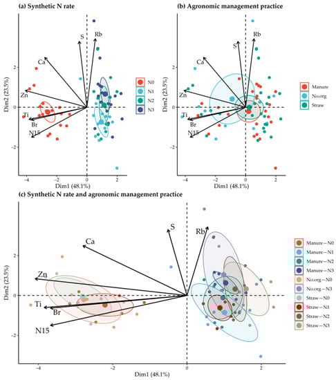 PCA analysis score plots (a–c) of macroelements (Ca, S), microelements (Ti, Zn, Rb, Br) and δ15N values in oat grains from 2016–2017 as a function of applied N rate and agronomic management practices of the long-term field experiment for the first and second principal components. The ellipses represent the mean and 95% confidence interval.