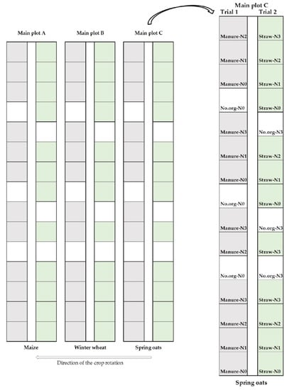 This study was conducted as part of a long-term field experiment IOSDV (International Organic Nitrogen Fertilization Experiment) at the testing station of the Agricultural Institute of Slovenia, in Jablje (46°30′17.4″ N, 15°37′34.6″ E; 320 m a.s.l., subalpine climate). The experiment was set up in 1992 with the main objective to study the long-term effects of management practices and synthetic N fertilization on soil fertility, soil organic carbon content and crop yields in rotation. A three-year rotation of maize, winter wheat and spring oats has been practiced. The IOSDV was laid out with three main plots where the crops in the rotation are grown each year. Each of the main plots was divided into two 450 m2 subplots (Figure 7). Each of the subplots is 90 m long and 5 m wide, with 2 m separation between subplots. The treatments for each crop are arranged within the two subplots. The basic arrangement of the IOSDV is factorial with three replications. Two main factors are agronomic management practice (control without organic amendment, incorporation of manure every third year, and incorporation of crop residues/cover crop in the rotation) and synthetic N rate. For each crop in the rotation, a total of 10 combinations of agronomic management practice and N rate were laid out in three replicates in 5 × 6 m plots. Details of each treatment, the amounts of synthetic N used, and the sequence of synthetic N application for oats are summarized in Table 5. A synthetic calcium ammonium nitrate fertilizer (27% N; 50% as ammonium-N and 50% as nitrate-N) was used for fertilizing oats. IOSDV is not fully randomized, as the incorporation of manure always occurs on the left subplot (Trial 1), and the incorporation of straw residues always occurs on the right subplot (Trial 2). In addition, control plots N0 (no.org–N0) are randomized within Trial 1, where manure is incorporated, and control plots N3 (no.org–N3) are randomized within Trial 2, where straw is incorporated.