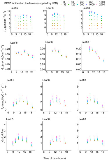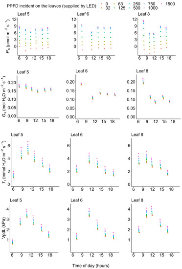 Diurnal courses of light-response curves on a moderately hot day (22 July 2021). PPFD: photosynthetic photon flux density supplied with an LED light source (LI-6400-02B), Pn: net photosynthetic rate, Gs: stomatal conductance, Tr: transpiration rate, and VpdL: vapor pressure deficit based on leaflet temperature. These values were measured with an LI-6400 system. All data are available in the Supplementary Materials.