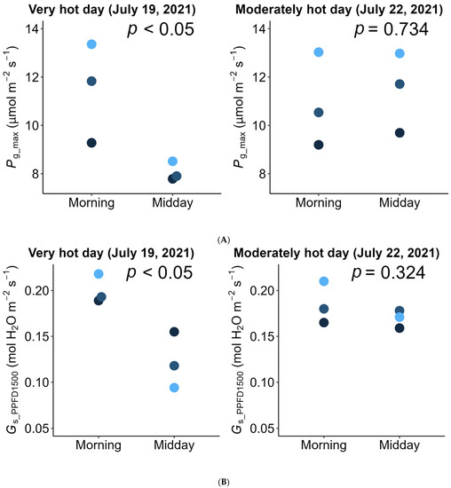 (A) Light-saturated gross photosynthetic rate (Pg_max) (see non-rectangular hyperbola (Equation (1)) in the Materials and Methods) and (B) stomatal conductance measured under PPFD = 1500 μmol m−2 s−1 (Gs_PPFD1500) observed in the morning (i.e., the earliest measurement on each day) vs. midday (i.e., the lowest values during 10:00–14:00). The results for the same leaflet measured at different times or days are shown in the same color. The p-values shown on the panels are the results of the generalized linear models to determine whether the differences (morning vs. midday) were significant.