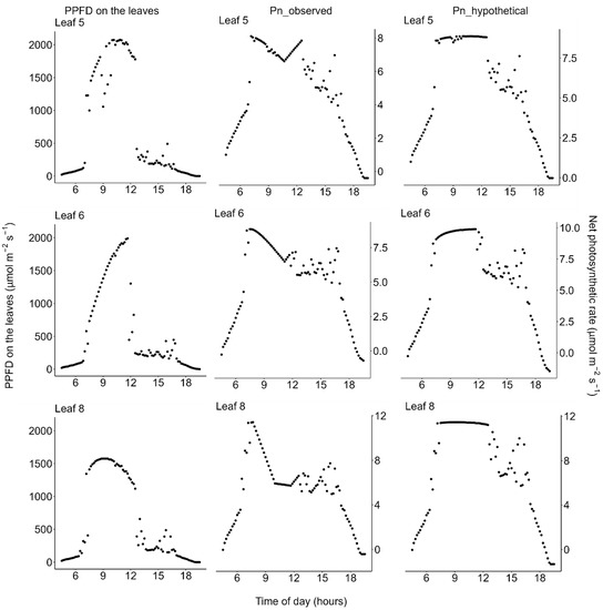 Diurnal courses of photosynthesis on the moderately hot days (22 and 23 July 2021). (Left) Photosynthetic photon flux density (PPFD) incident on each leaflet of Menyanthes trifoliata, (middle) Pn_observed: actual net photosynthetic rate calculated based on both the observed diurnal change of photosynthetic light-response curve (Figure 5) and the diurnal change of PPFD, and (right) Pn_hypothetical: simulated hypothetical net photosynthetic rate calculated by holding the photosynthetic light-response curve constant throughout the day, fixed at the curve observed in the early morning for each leaflet (Figure 5). Note that: (1) PPFD was measured on 23 July and the PPFD data were used to estimate photosynthesis on 22 July, the day on which the light-response curves shown in Figure 5 were measured, and (2) in the afternoon, the plants were shaded by trees on the pond shore (see Figure 1 for detailed weather conditions). All data are available in the Supplementary Materials.