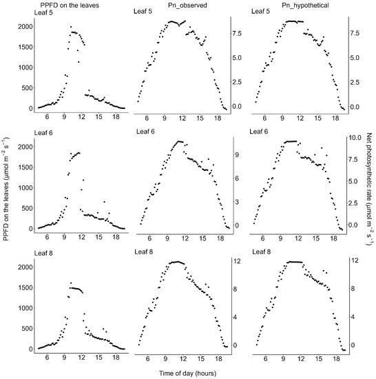 Using data of the diurnal change in PPFD incident on each leaflet (Figure 4, left column) and the observed diurnal change of photosynthetic light-response curves (Figure 2), we estimated the diurnal course of the net photosynthetic rate (Pn) under the actual field light intensity. Midday depression was observed for the estimated actual diurnal courses of net photosynthetic rate (Figure 4, middle column). Additionally, we performed a simulation in which the effect of midday depression was hypothetically excluded. In this simulation, the photosynthetic light-response curve was fixed at that obtained from the earliest measurement of each leaflet within each measurement day. Further, diurnal course of net photosynthetic rate under this hypothetical scenario was then calculated the same way as that of the actual diurnal course of photosynthetic rate as described above, using the same PPFD data for each leaflet. Under this hypothetical situation, no midday depression was simulated (Figure 4, right column). On the moderately hot day (July 22), the leaves showed neither morning reduction of photosynthetic capacity nor midday depression of photosynthetic rate (Figure 3, Figure 5 and Figure 6).