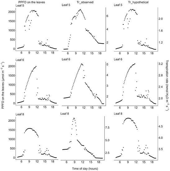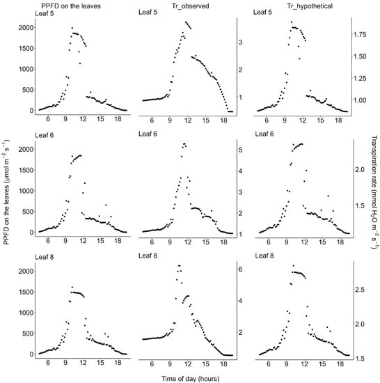 Diurnal courses of transpiration on the moderately hot days (22 and 23 July 2021). (Left) Photosynthetic photon flux density (PPFD) incident on each leaflet of Menyanthes trifoliata, (middle) Tr_observed: actual transpiration rate per unit area of leaf calculated based on both the observed diurnal change of the PPFD-transpiration response curve (Figure 5) and the diurnal change of PPFD, and (right) Tr_hypothetical: simulated transpiration rate calculated by holding the PPFD-transpiration response curve constant throughout the day, fixed at the curve observed in the early morning for each leaflet (Figure 5). Note that: (1) PPFD was measured on 23 July and the PPFD data were used to estimate transpiration on 22 July, the day on which light-response curves shown in Figure 5 were measured; and (2) in the afternoon, the plants were shaded by trees on the pond shore (see Figure 1 for detailed weather conditions). All data are available in the Supplementary Materials.